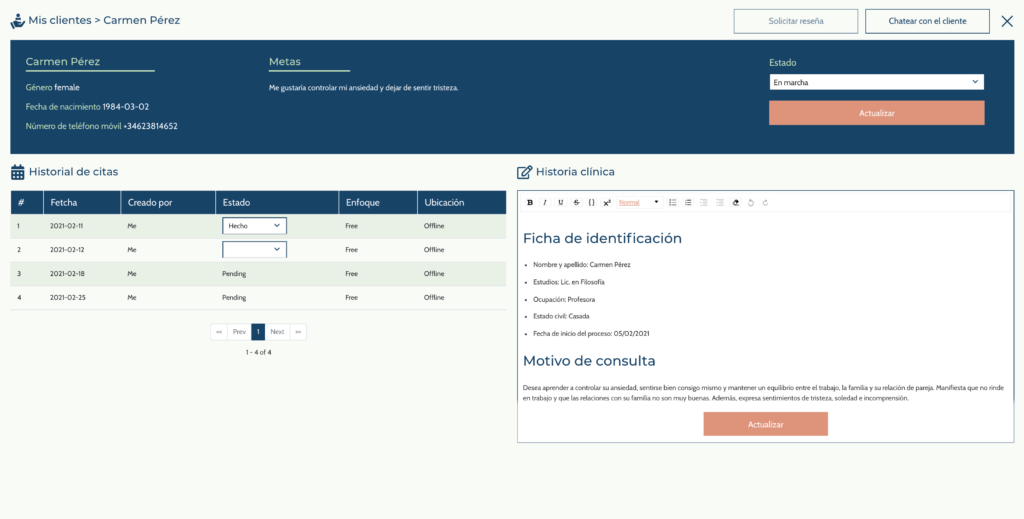 Nuna, por el contrario, no está pensado para todos los tipos de profesiones sanitarias, sino que está exclusivamente diseñado para psicólogos y profesionales de la salud mental. Por ello, podrás tomar notas durante y después de las sesiones de terapia y su plantilla ya está prediseñada para psicólogos. Además, es posible añadir notas evolutivas para cada cliente.