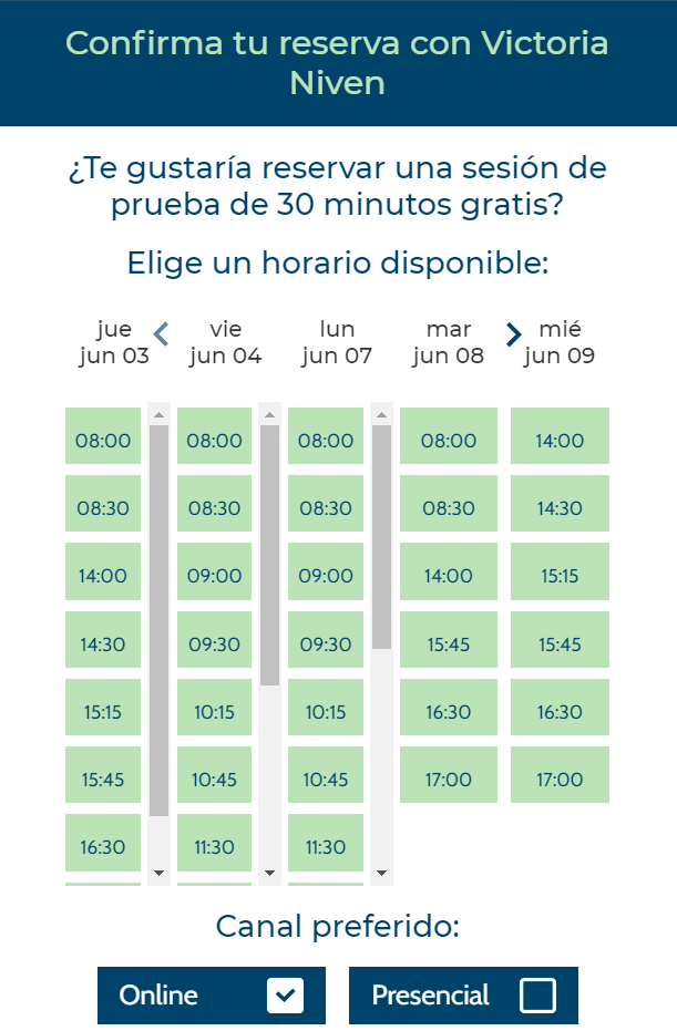Tener tu calendario visible en un software de gestión, donde tus pacientes puedan consultar tus horarios disponibles, pedir citas o solicitar reprogramaciones en base a tu disponibilidad, es una gran herramienta para evitar que los pacientes falten a la consulta. Puedes permitir cambios hasta 24 o 48 horas antes según tu disponibilidad y ofrecerle al paciente cierta flexibilidad para que no deje de asistir a la consulta. Si, además, el software de citas está integrado con Google Calendar, podrás tener un mejor control sobre las sesiones y acceder rápidamente al enlace de la videollamada (si la sesión es en línea), como así también a los detalles de tu paciente.