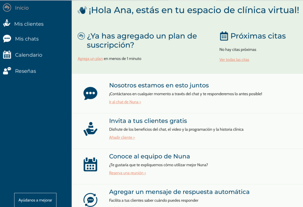 Nuna es un software para psicólogos que te permite gestionar todas las tareas de tu consulta desde un mismo lugar. Además, es gratis. ¡Pruébalo!