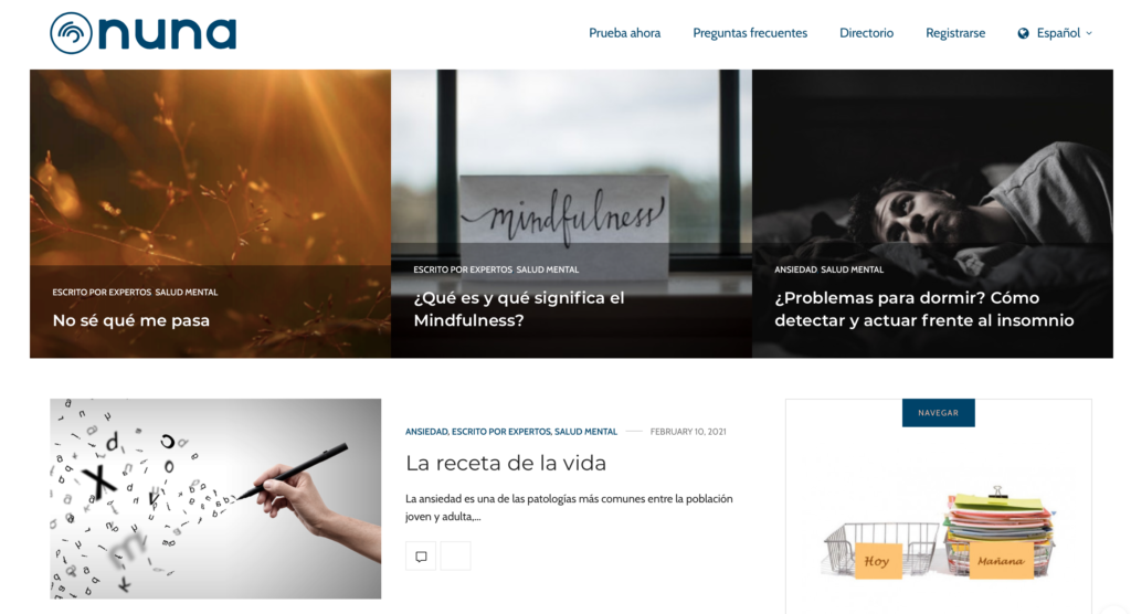 Si aún no tienes un blog propio, puedes comenzar por escribir contenido en el blog de algún colega o en algún sitio web de interés para profesionales de la psicología. Nuna, por ejemplo, incluye entre sus diversas funciones la posibilidad de aumentar tu visibilidad online a través de la participación en su blog interno. Publicar material a tu nombre es una excelente opción para darte a conocer a través de internet, sobre todo cuando aún no tienes una red de trabajo sólida.