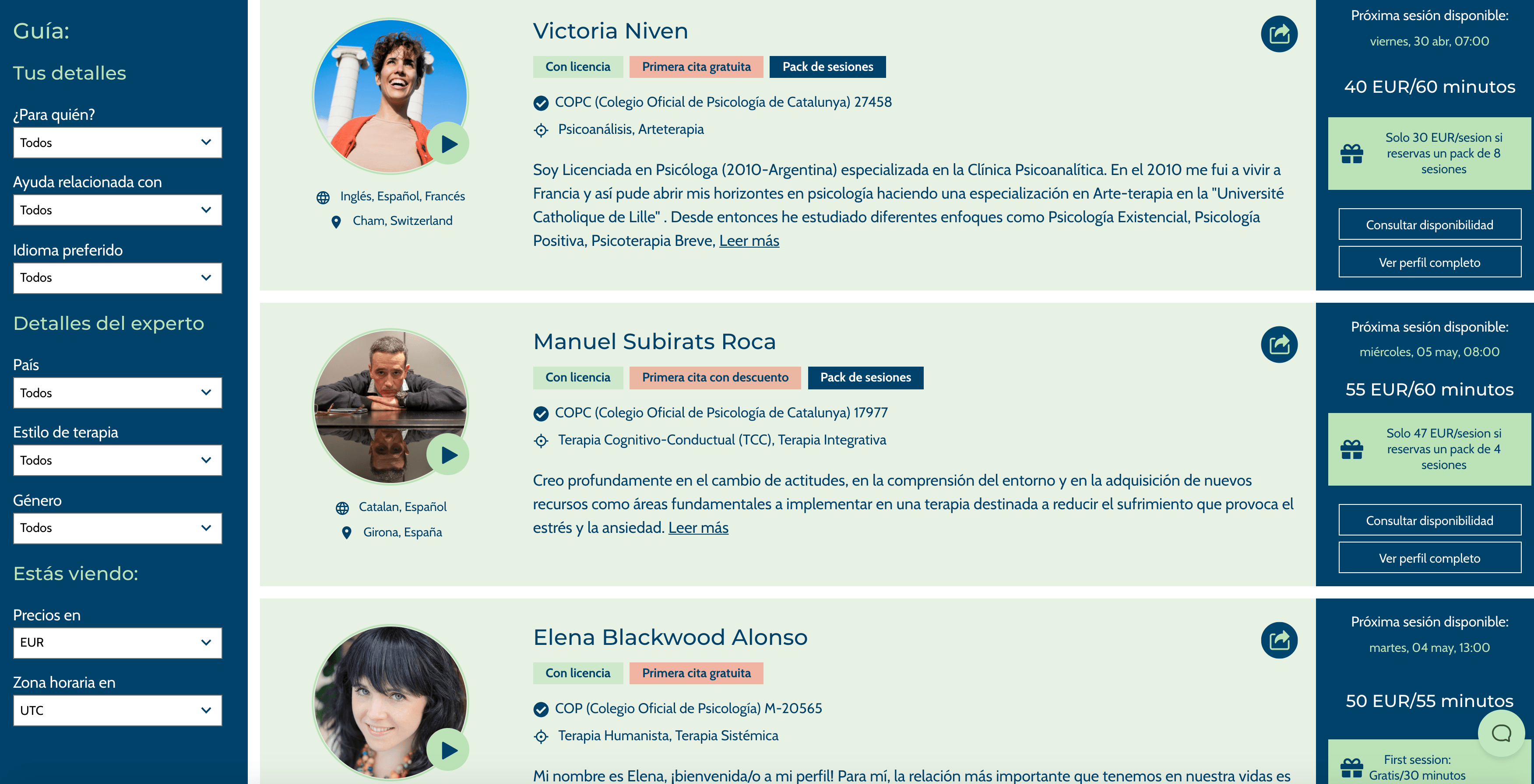 Otras, como Nuna, cuentan con un filtro para que los potenciales pacientes escojan al profesional que mejor se adapta a su idioma, estilo de terapia, divisa, zona horaria, etc. Los filtros suelen ser una buena manera de personalizar los servicios y de ayudar al psicólogo para que su nombre no quede perdido en una lista interminable de profesionales.