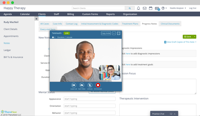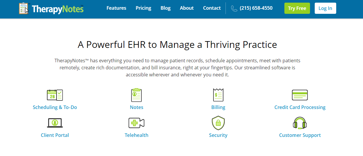 TherapyNotes es un sistema de gestión en la nube para los profesionales de salud mental certificado por la ley HIPAA. Ayuda a agilizar las tareas administrativas, tales como tomar notas, programar citas, crear facturas y más. El software incluye un portal para los clientes e historias clínicas electrónicas con una variedad de plantillas de notas. La plataforma permite a los terapeutas crear planes de tratamiento personalizados directamente en el software, agregar notas después de las evaluaciones y actualizar la evolución del paciente.