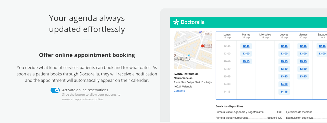 Cuando un cliente reserva una cita, Docplanner.es envía recordatorios automáticos para reducir el ausentismo y mantenerte la agenda llena. Docplanner cuesta entre 50 y 100 € al mes.